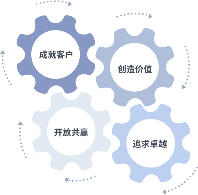 成就客户是一切决策的出发点,,,创造价值是衡量所有工作的标准,,,,追求卓越是我们做事做人的态度,,,,开放共赢是我们的格局也是最终的结果。。。。价值观的齿轮环环相扣,,推动着组织里的每个人不断向前。。。