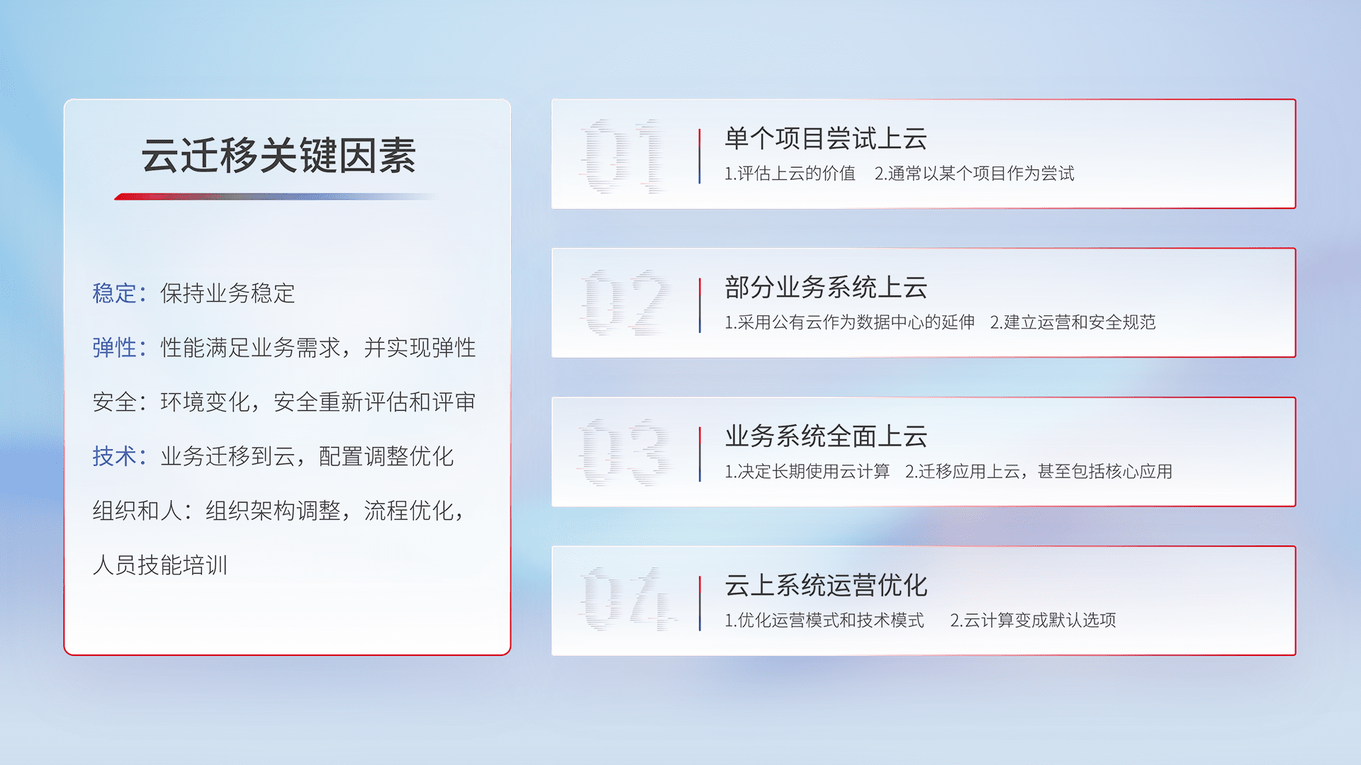 结合实际业务,,,,从规划设计、、、、云平台选型、、、、云原生改造、、数据迁移、、、集成交付,,,迁移全过程为客户识别最佳上云路径,,,,做好风险识别管理,,,设计网络架构、、、、身份权限、、、、安全审计合规、、、操作审计、、、日志审计、、监控告警策略、、、多站点容灾设计等,,,,对云上基础设施进行整体规划,,提升IT治理水平,,,,以满足弹性、、高可用、、、、高性能的需求。。