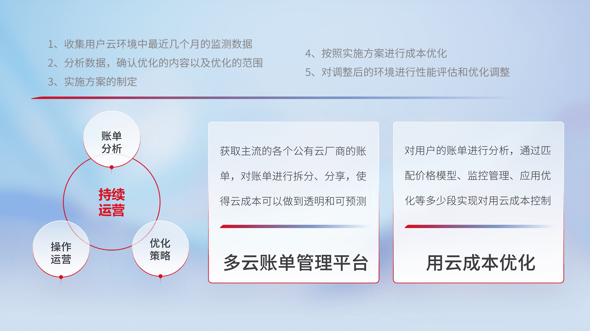 通过多云纳管,,以统一的资源数据模型把客户的云资源进行抽象和封装,,,进而实现对多云资源的统一操作,,保障云资源管理的可靠性、、稳定性与可用性。。。。量身定制化运维内容,,配置、、、、开发运维、、、、补丁管理、、、、备份、、监控、、、、认证和访问管理、、、审计和日常巡检等,,,保障在用云过程中的可靠度,,,稳定度以及高可用率。。。。