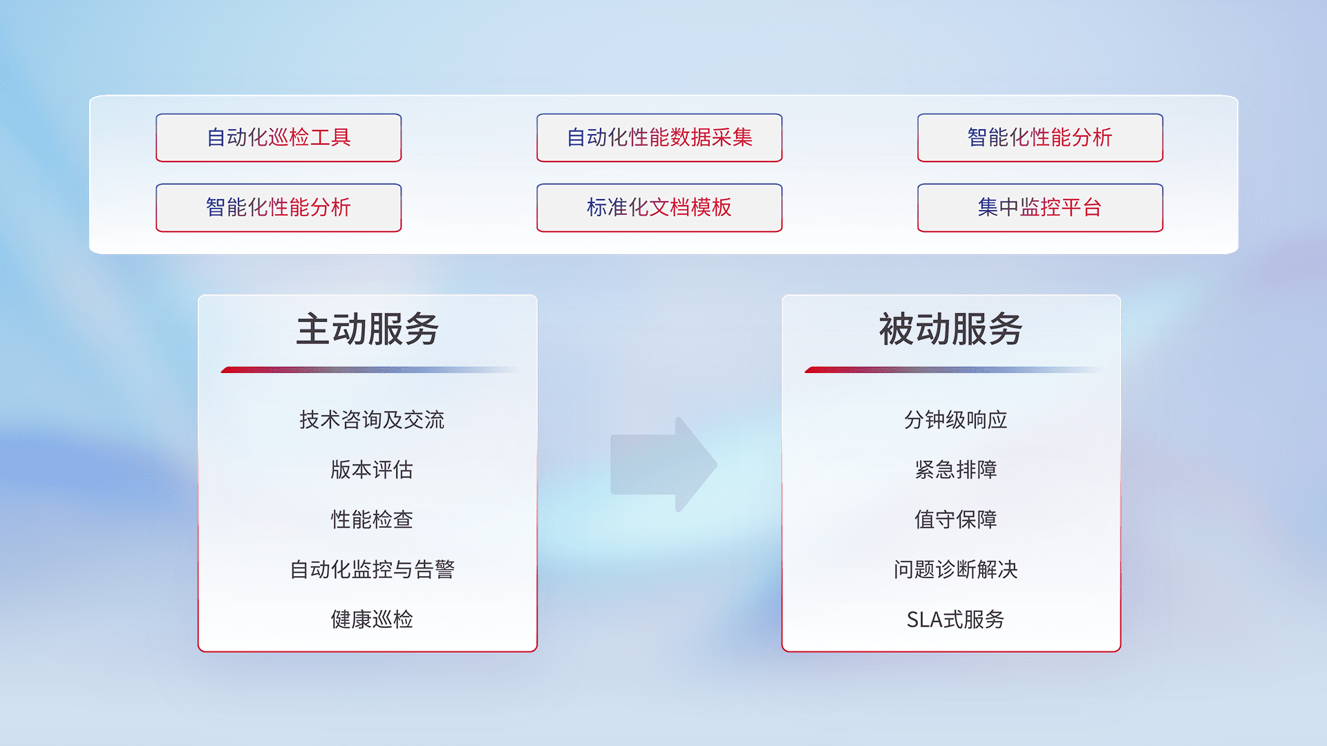 智能化工具和标准化文档,,,,保障服务质量,,,,提供主动服务(包含技术咨询、、、、版本评估、、、性能检查、、、、自动化监控与告警、、健康巡检)和被动服务包含(分钟级响应、、、紧急排障、、、值守保障、、、问题诊断解决、、SLA服务)。。